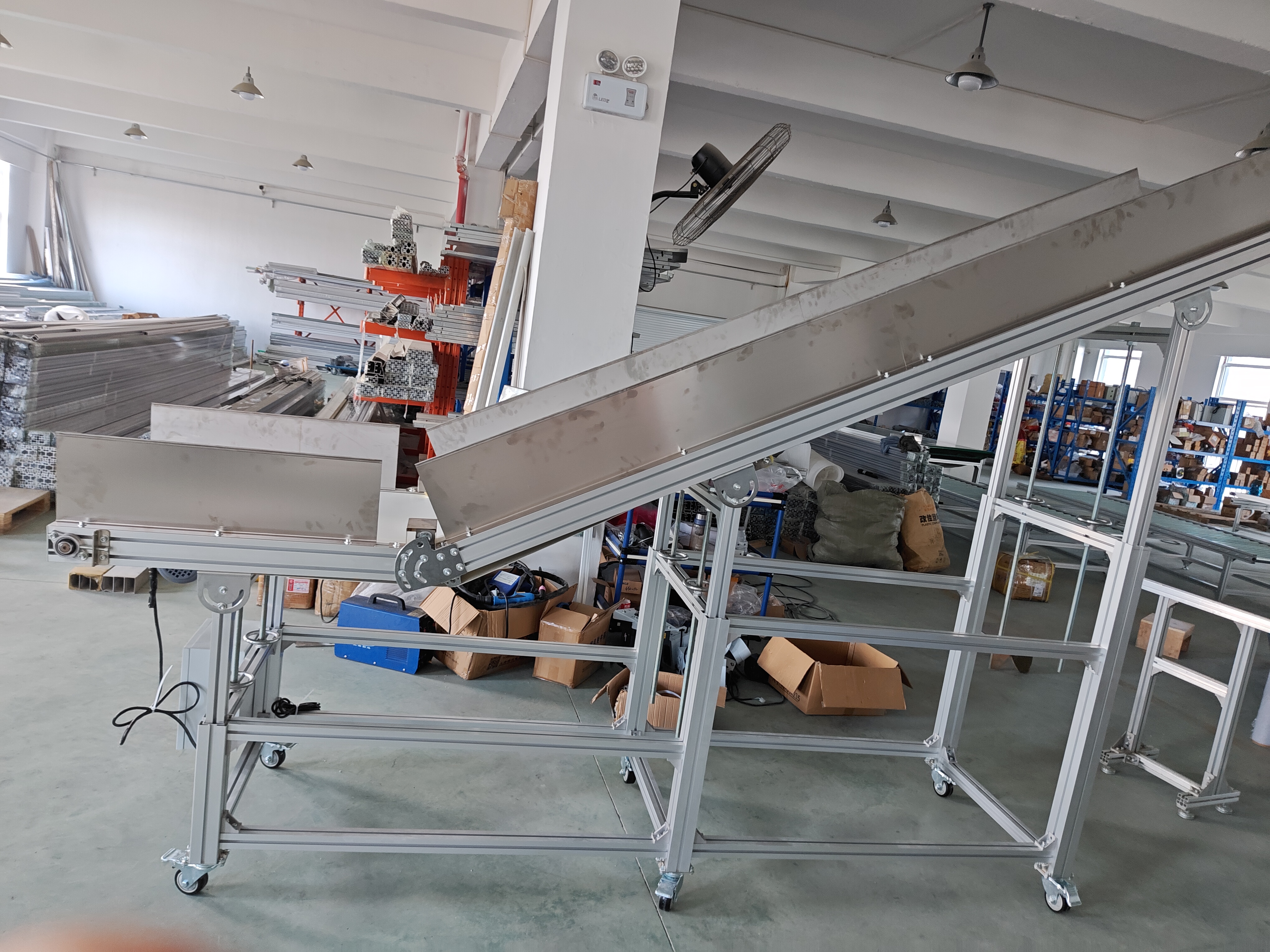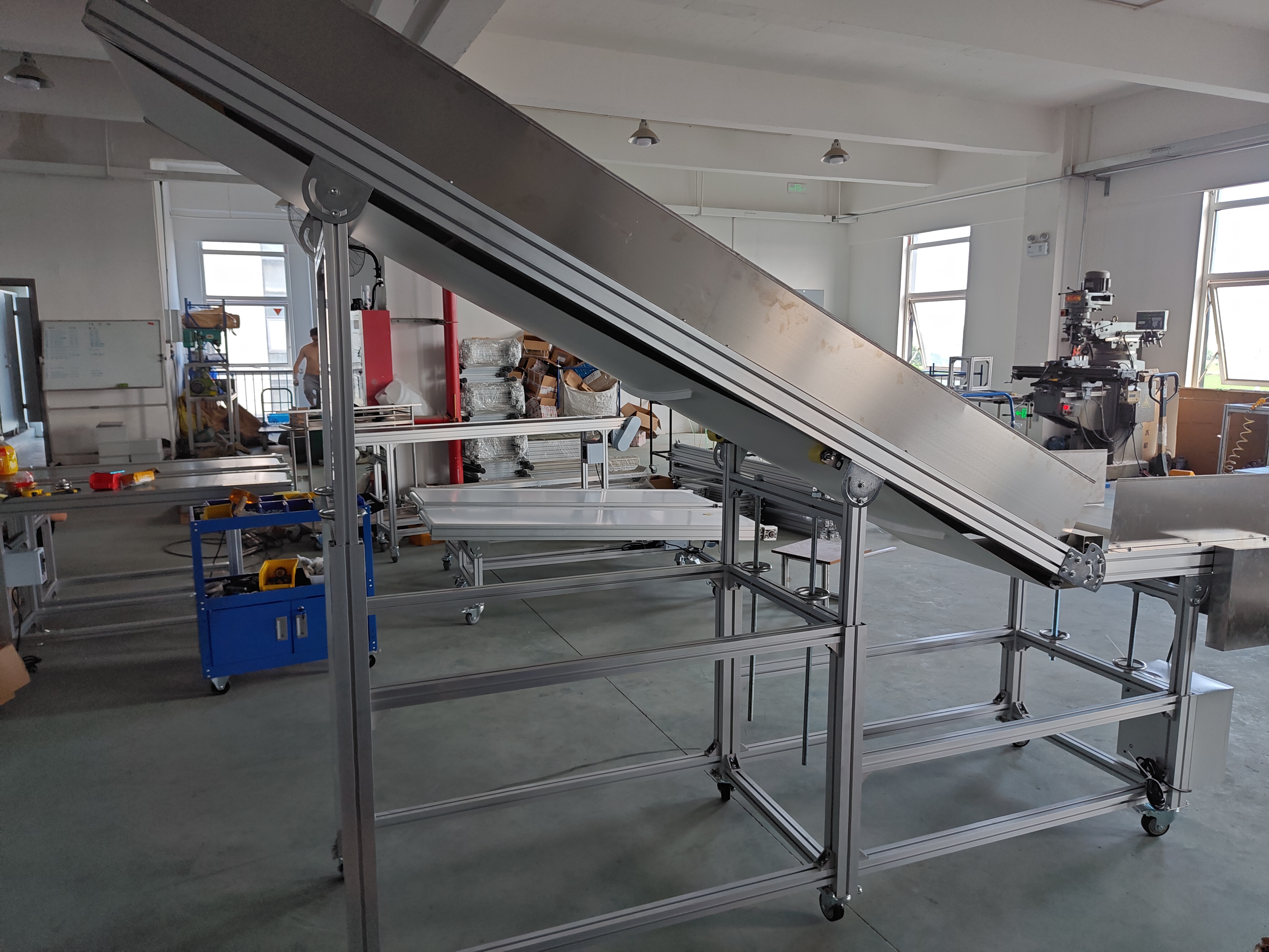 2500mm長(zhǎng)+800mm(平臺(tái))X600帶寬(680mm總寬)x低端高度700-900mm/高端高度1900-2100mm,平臺(tái)在下,皮帶有效寬度是470mm,承重30公斤,速度50米/分鐘